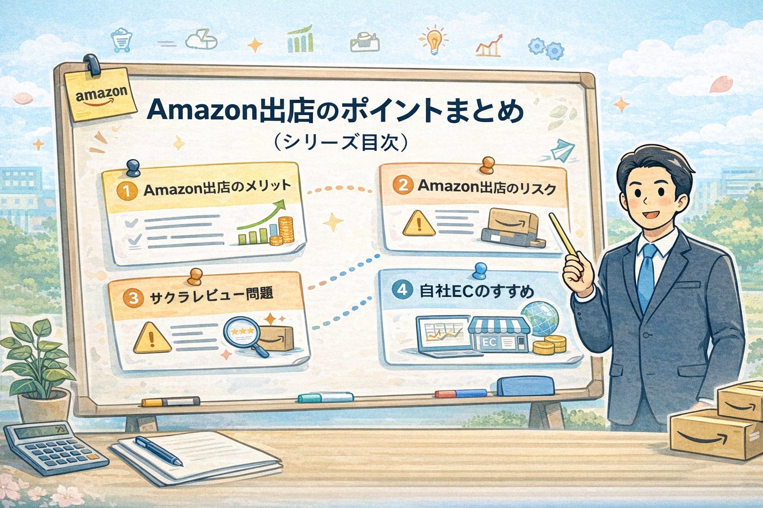 思考ログ ネットショップ運営 Amazon出店のポイントまとめ(シリーズ目次) 2026.02.27 Amazon出店のポイントまとめ(シリーズ目次) Amazon出店シリーズの内容 🏪 元店長からのメッセージ Amazon出店を検討中の方や、運営にお悩みの方へ。 元店長としての実体験をもとに、出店のメリットからリスク、自社ECとの併用まで、現場のリアルな視点で全4回にわたってまとめました。 気になるテーマから、ぜひチェックしてみてください。 1 Amazon出店のメリット 集客力・信用力・FBAの仕組みを元店長が解説 読む → 2 Amazon出店のリスク ブランド盗用・モール依存の現実と対策 読む → 3 サクラレビュー問題 レビューの実態と正しい付き合い方 読む → 4 自社ECのすすめ モール依存から脱却する自社EC活用法 読む → Post Share Hatena Line RSS feedly Pin it note yamashita デザイン工房YAMASHITA|元ネットショップ店長 ECサイトの運営を長年担当し、受注管理から商品企画、画像制作まで幅広く経験してきました。 日々の業務をコツコツ積み上げることが好きな性分です。 一人の時間が増えたことをきっかけにブログをはじめ、EC運営・デザイン・AIツールについて実体験をもとに発信しています。 趣味はギブソンJ45を趣味程度に弾いています。 ブレンディボトルコーヒーが好きで、現在Mac mini+4Kモニターの導入を検討中です。 🧠 AIが同じ説明を何度もする本当の理由 前の記事 ③サクラレビュー問題 次の記事