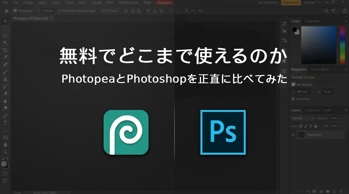 PhotopeaはPhotoshopと同じメニュー配列で、使い勝手もよく似ています。「無料でここまで使えるのか」と正直驚きました。もちろん100点満点とは言えませんが、ある程度の作業は十分こなせますし、場合によってはクオリティの高い制作物も作れます。ただ、使っていくうちに「あれ?」と気づく制限や、できないこともいくつかあります。この記事では、Photoshopと比べながら、できること・できないことを正直にお伝えしていきます。